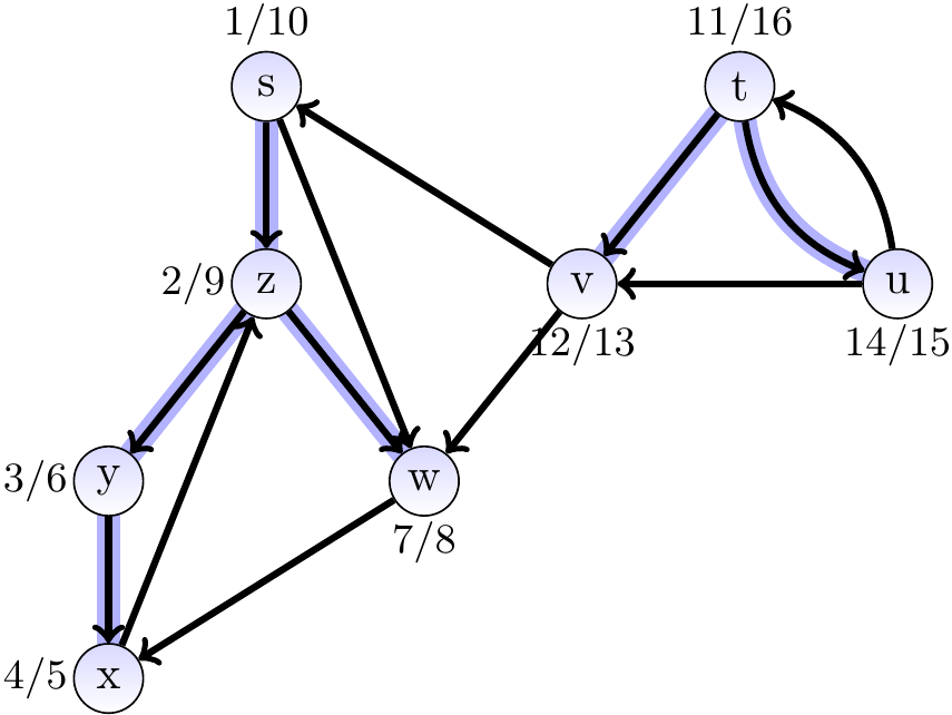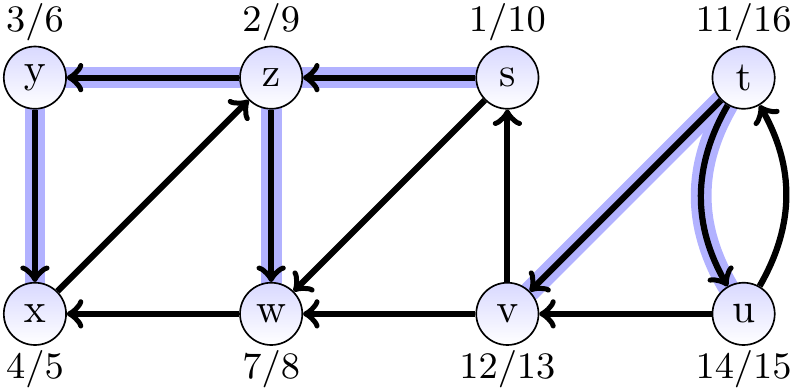 Consider again the directed graph below. Again, the edges in the depth-first forest are highlighted in blue.