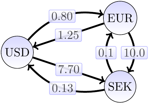 Suppose that we are given a set of exchange rates between some currencies. Is it possible to change money between the currencies so that we end up in having more in the original currency? That is, does the exchange rate graph have a cycle with the product of the edge weights more than 1? As an example, consider the exchange rate graph below.