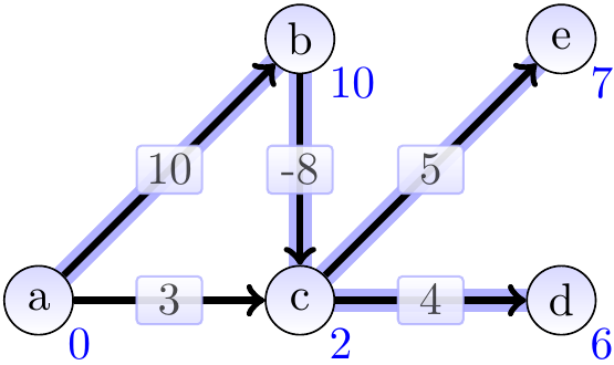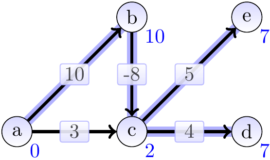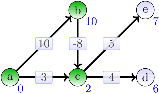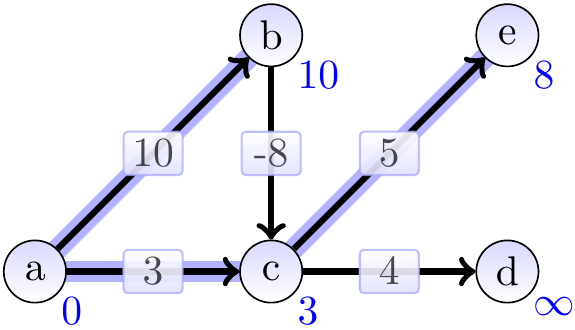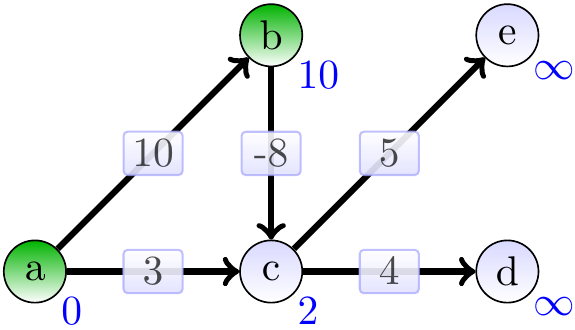 The situation is stabilized already after the third iteration. Here the edges were relaxed in the following order: \( \Tuple{c, d} \), \( \Tuple{b, c} \), \( \Tuple{a, c} \), \( \Tuple{a, b} \), \( \Tuple{c, e} \).
