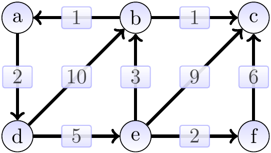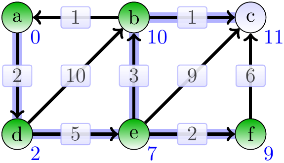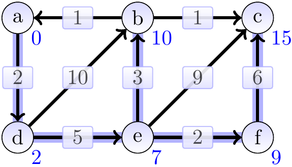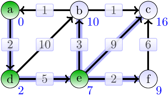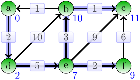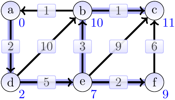Consider the graph below. The shortest-path weight from \( a \) to \( c \) is 11 produced by the path \( \Path{a,d,e,b,c} \). On the other hand, \( \SPDist{f}{b} = \infty \) as there is no path from \( f \) to \( b \).