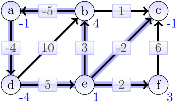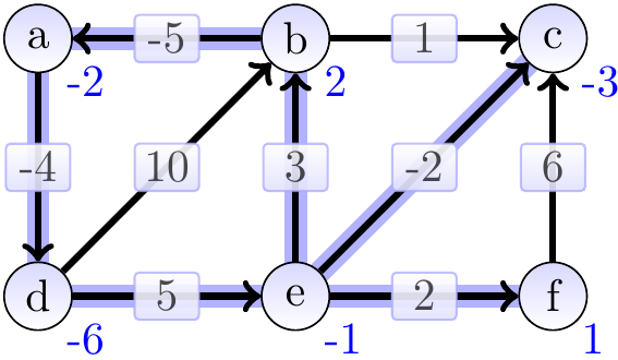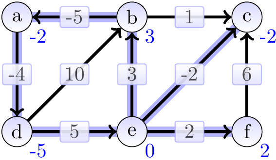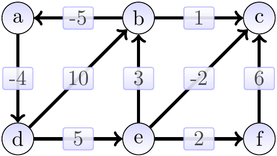 We have to pay special attention to negative edge weigths when considering “shortest paths”, which are actually “paths with the smallest cumulative weight”. We say that a cycle \( p = \Path{v_0,…,v_k,v_0} \) is a negative-weight cycle (or simply a “negative cycle”) if \( w(p) < 0 \). If any path from a vertex \( u \) to \( v \) contains a negative cycle, then the shortest-path weight from \( u \) to \( v \) is not well-defined and we may write \( \SPDist{u}{v} = -\infty \).