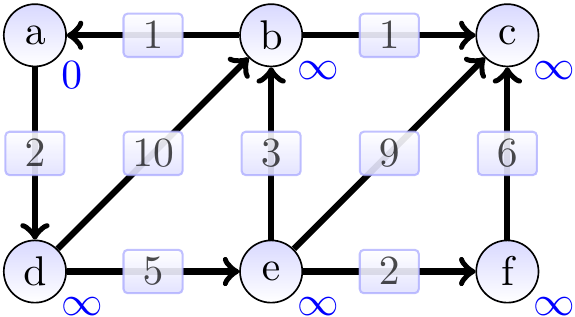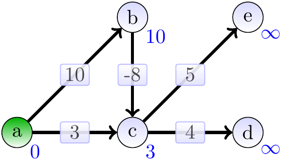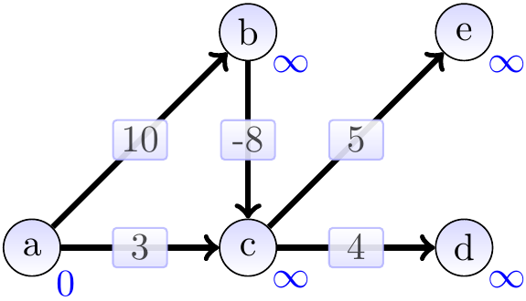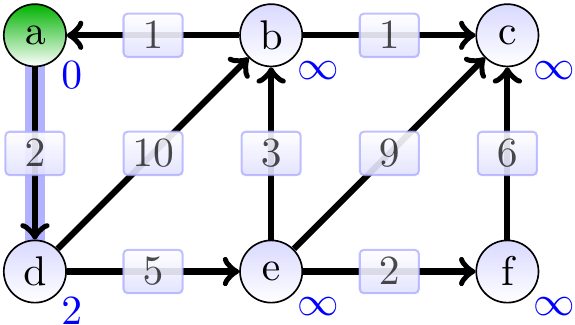 Consider the graph below and let the source vertex be \( a \). The vertex annotations showing the estimates in the beginning.