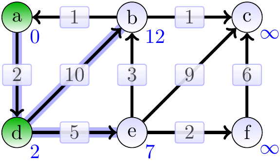 Next, the vertex \( d \) has the smallest estimate (which in fact is the correct shortest-path weight from \( a \) to \( d \)) and we dequeue it from the queue and update the estimates of its neighbours.