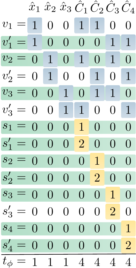 The subset \( S’ \) of \( S_{\phi} \) highlighted with green in the figure is a solution to \( \Tuple{S_{\phi}, t_{\phi}} \). The assignment \( \TA = \{x_1 \mapsto \False,x_2 \mapsto \True,x_3\mapsto\True\} \) corresponding to \( S’ \) satisfies the formula \( \phi \).