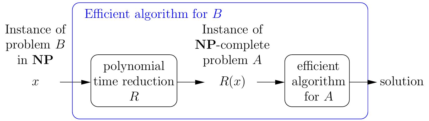 Thus if one can reduce the current problem \( B \) into one of the problems \( A \) above, it may be possible to obtain a practically efficient solving method without programming the search method by one-self. Notice that here we are using reductions in the other direction compared to the case when we proved problems \( \NP \)-complete: we now take the problem which we would like to solve and reduce it a problem for which we have an usually-efficient tool available: