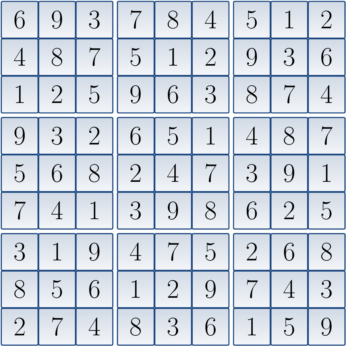 The corresponding CNF formula is: \begin{eqnarray*} (x_{1,1,1} \lor x_{1,1,2} \lor … \lor x_{1,1,9}) \land … \land (x_{9,9,1} \lor x_{9,9,2} \lor … \lor x_{9,9,9}) &\land&\\ (\neg x_{1,1,1} \lor \neg x_{1,1,2}) \land … \land (\neg x_{9,9,8} \lor \neg x_{9,9,9}) &\land&\\ (x_{1,1,1} \lor x_{1,2,1} \lor … \lor x_{1,9,1}) \land … \land (x_{9,1,9} \lor x_{9,2,9} \lor … \lor x_{9,9,9}) &\land&\\ (x_{1,1,1} \lor x_{2,1,1} \lor … \lor x_{9,1,1}) \land … \land (x_{1,9,9} \lor x_{2,9,9} \lor … \lor x_{9,9,9}) &\land&\\ (x_{1,1,1} \lor x_{1,2,1} \lor … \lor x_{3,3,1}) \land … \land (x_{7,7,9} \lor x_{7,8,9} \lor … \lor x_{9,9,9}) &\land&\\ (x_{1,8,1}) \land (x_{2,1,4}) \land (x_{3,2,2}) \land … \land (x_{9,6,6})&& \end{eqnarray*} When the formula is given to a SAT solver, it declares that the formula has a model in which all \( x_{1,1,i} \) except \( x_{1,1,6} \) are false, and so on. From the variables that are true, we obtain the following (unique) solution to the original Sudoku grid: