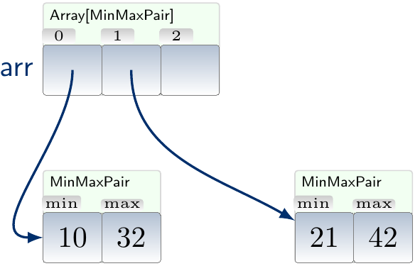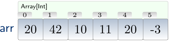 Arrays are a built-in type in many programming languages: Java virtual machine, C/C++, and so on. Here arrays are defined to mean fixed-sized sequences of elements of the same type, allocated in a continuous block of memory. In many programming languages, “arrays’’ can mean more sophisticated data structures, see the discussion at the end of this section. In Java and Scala, elements in arrays are either primitive types or references to objects residing in their own memory locations. Some other languages, such as C and C++, allow array elements to be structured objects.