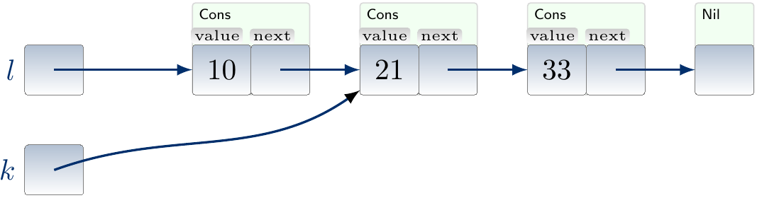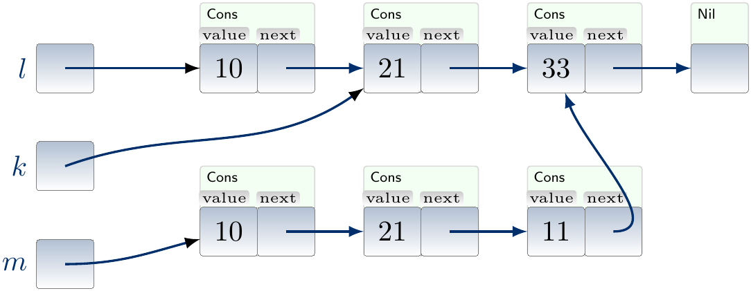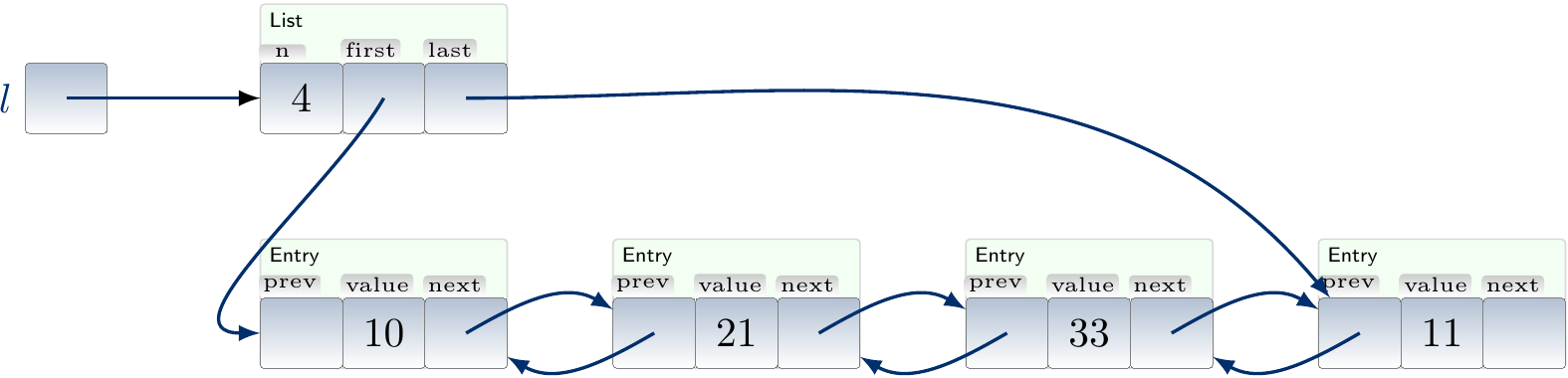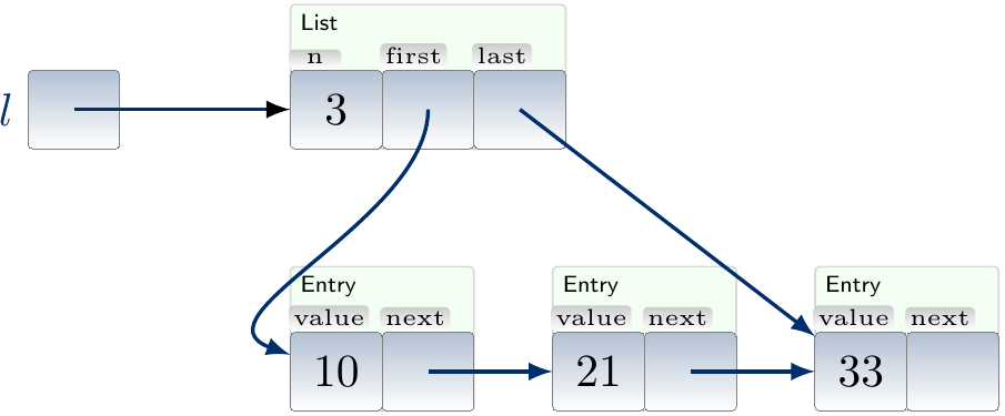 One can also have a mutable version of linked lists. In such lists, the list entries are not shared between different lists. Furthermore, it is common to have a separate object for maintaining some addional information: (i) the reference the first entry in the list, (ii) the reference the last entry in the list, and (iii) the current list length. With such additional information, one can add and remove elements both in the beginning and at the end of the list in constant-time. Furthermore, finding out the size of the list is easy as well.
