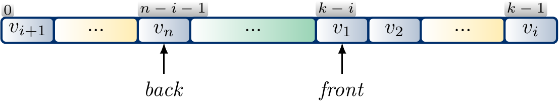 Another implementation technique is to use circular buffers backed by resizable arrays. In them a queue \( v_1,v_2,…,v_n \) is stored in a resizable array of size \( k \ge n \). A \( \Front \) index points to the array element containing \( v_1 \) and the queue elements are then in the indices \( \Front \), \( \Front+1 \), …, \( \Front+n-1 \) modulo \( k \). The \( \Back \) index is \( \Front+n-1 \bmod k \). Enqueueing now corresponds to increasing the \( \Back \) index by one (modulo \( k \) as always) and writing the enqueued element in the new index. If \( n \) would be greater than \( k \), then the array is resized and the queue contents are copied to the new larger array. Dequeueing is done by simply increasing the \( \Front \) index by one (modulo \( k \)). Note that circular buffers also allow constant-time random access to the queue elements.