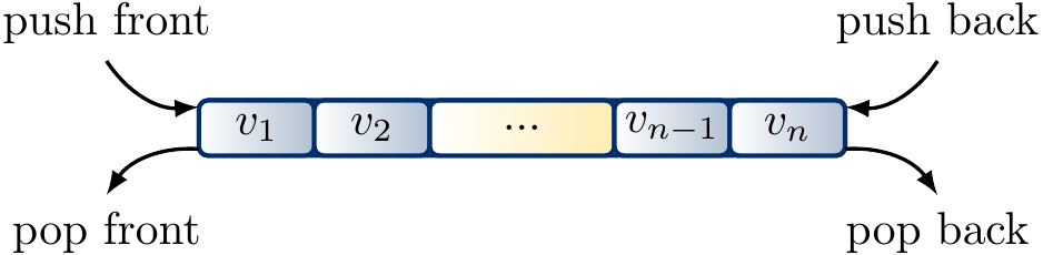 Double-ended queues (abbreviated to deques, pronounced “deck”) extend queues by allowing removing elements at the end and inserting elements in the beginning as well.