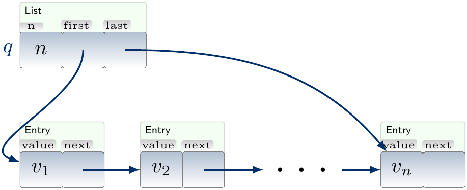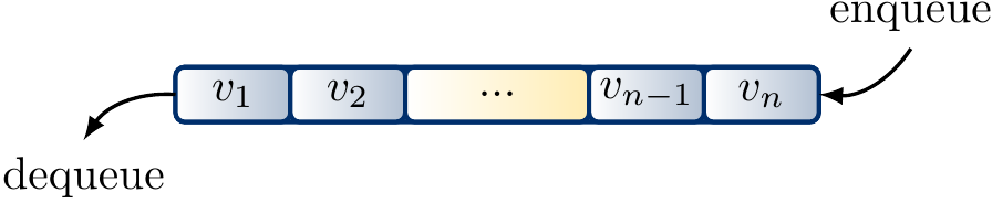 Queues are easy to implement with mutable linked lists so that both enqueue and dequeue are constant-time operations: for an enqueue operation, one only has to insert a new list entry at the end, while dequeue corresponds to removing the first list entry.