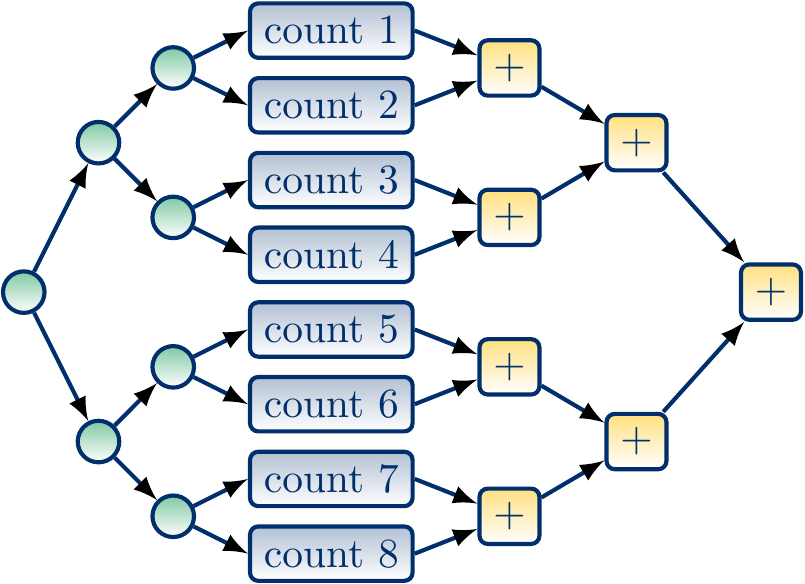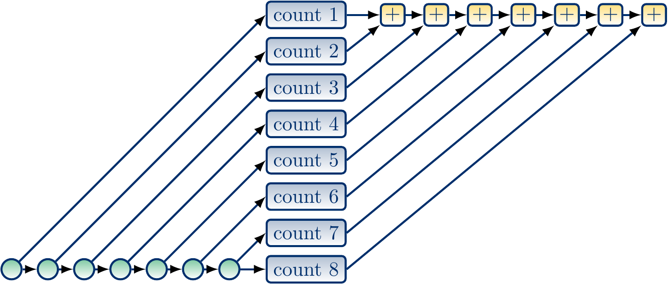 In this recursive version, the creation of new tasks as well as the final sum computation are also parallelized. If we split the array until there is only one element left, the worst-case span can be obtained from the recurrence $$T(1) = c \text{ and } T(n) = d+ \max\Set{T(\Floor{n/2}),T(\Ceil{n/2})}$$ where \( c \) is the time taken for the predicate computation and \( d \) is some constant. Substituting \( n = 2^k \) for some non-negative \( k \), we get \( T(2^k) = d + T(2^{k-1}) = … = kd + c \). Thus the worst-case span is \( T(n) = c + d\Lg{n} = \Theta(c + \Lg{n}) \). If the predicate can be evaluated in constant time, it is possible to count the number of elements satisfying the predicate in logarithmic time when \( \Theta(n) \) computing resource are available.