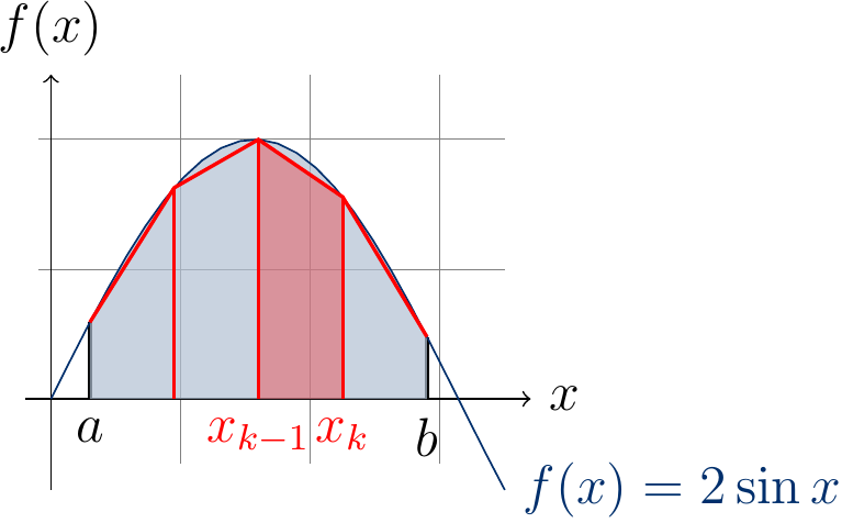 The example figure below shows the approximation of \( \int_{0.3}^{2.9} 2\sin(x) dx \) (the area shaded in blue) when \( N=4 \): the approximating area of the sub-interval \( [x_2,x_3] \) is shaded in red.