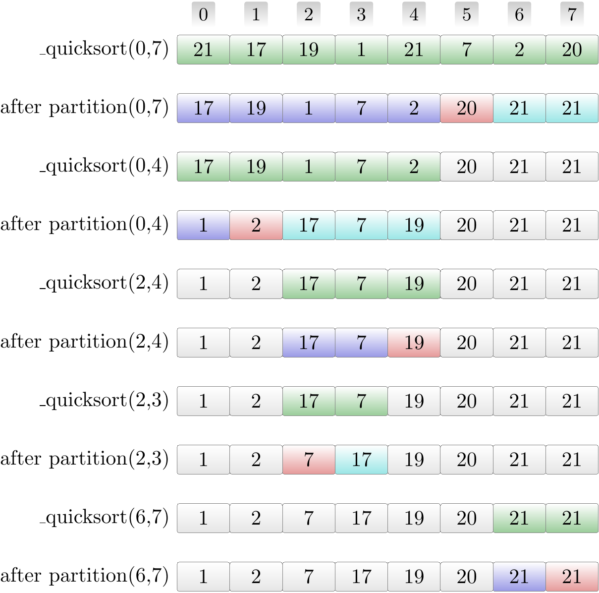 Consider the basic version shown above in Scala. The figure below shows the recursive calls and the results after partitioning in the order they are executed.