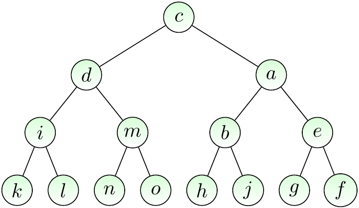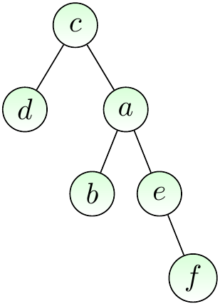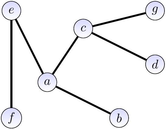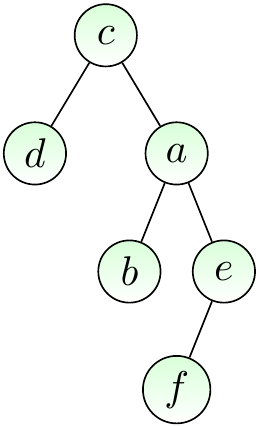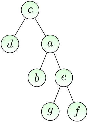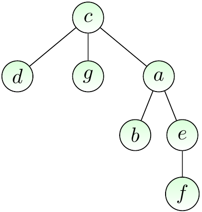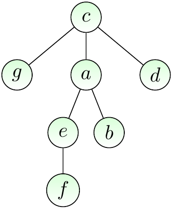 The figure below shows a rooted version of our earlier free tree when the root node is \( c \). When we draw rooted trees, the root is always drawn in the same place, usually at top.