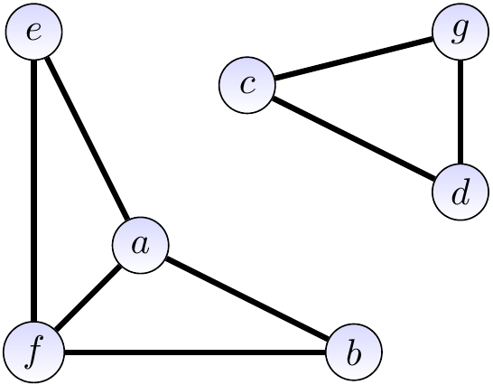 For instance, after calling \( \UFUnion{a}{b} \) and \( \UFUnion{a}{e} \) because of the edges \( \Set{a,b} \) and \( \Set{a,e} \), the disjoint-sets are \( \Set{a,b,e},\Set{c},\Set{d},\Set{f},\Set{g} \).