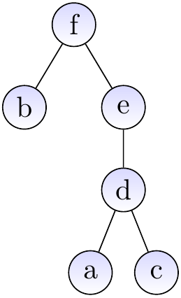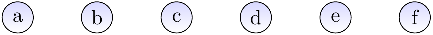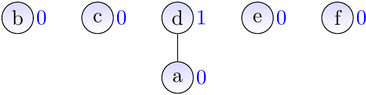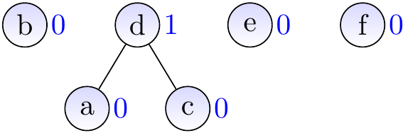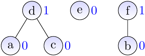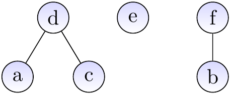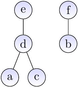 Suppose that we have introduced the elements \( a,b,…,f \) with \( \UFMS{} \) and then made unions so that the current sets are \( \Set{a,c,d,e} \) and \( \Set{b,f} \). The graph below shows one possible representation for the current situation. The representatives of the two sets are \( e \) and \( f \), respectively.