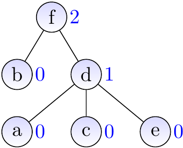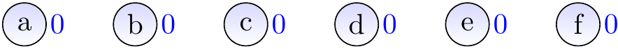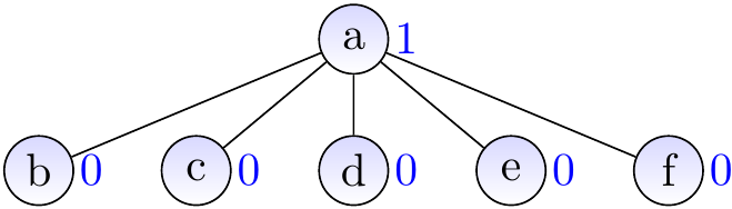 Let’s replay of our earlier worst-case example but now with ranks. The result of applying \( \UFUnion{a}{b} \), \( \UFUnion{a}{c} \), \( \UFUnion{a}{d} \), \( \UFUnion{a}{e} \), and \( \UFUnion{a}{f} \) is no longer a linear tree but a very shallow one.