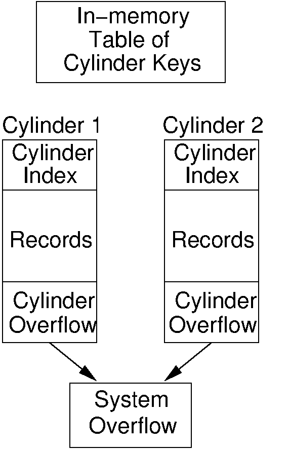 ISAM is based on a modified form of the linear index, as illustrated by Figure 8.12.1. Records are stored in sorted order by primary key. The disk file is divided among a number of cylinders on disk. Each cylinder holds a section of the list in sorted order. Initially, each cylinder is not filled to capacity, and the extra space is set aside in the cylinder overflow. In memory is a table listing the lowest key value stored in each cylinder of the file. Each cylinder contains a table listing the lowest key value for each block in that cylinder, called the cylinder index. When new records are inserted, they are placed in the correct cylinder's overflow area (in effect, a cylinder acts as a bucket). If a cylinder's overflow area fills completely, then a system-wide overflow area is used. Search proceeds by determining the proper cylinder from the system-wide table kept in main memory. The cylinder's block table is brought in from disk and consulted to determine the correct block. If the record is found in that block, then the search is complete. Otherwise, the cylinder's overflow area is searched. If that is full, and the record is not found, then the system-wide overflow is searched.