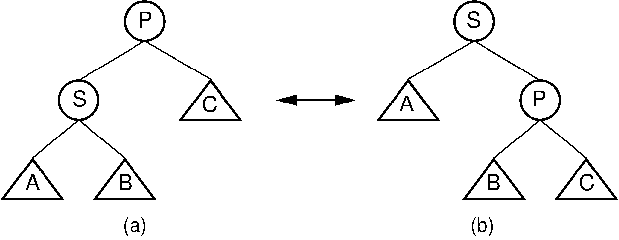 Figure 8.8.1: Splay tree single rotation. This rotation takes place only when the node being splayed is a child of the root. Here, node \(S\) is promoted to the root, rotating with node \(P\). Because the value of \(S\) is less than the value of \(P\), \(P\) must become \(S\) 's right child. The positions of subtrees \(A\), \(B\), and ;math:C are altered as appropriate to maintain the BST property, but the contents of these subtrees remains unchanged. (a) The original tree with \(P\) as the parent. (b) The tree after a rotation takes place. Performing a single rotation a second time will return the tree to its original shape. Equivalently, if (b) is the initial configuration of the tree (i.e., \(S\) is at the root and \(P\) is its right child), then (a) shows the result of a single rotation to splay \(P\) to the root.