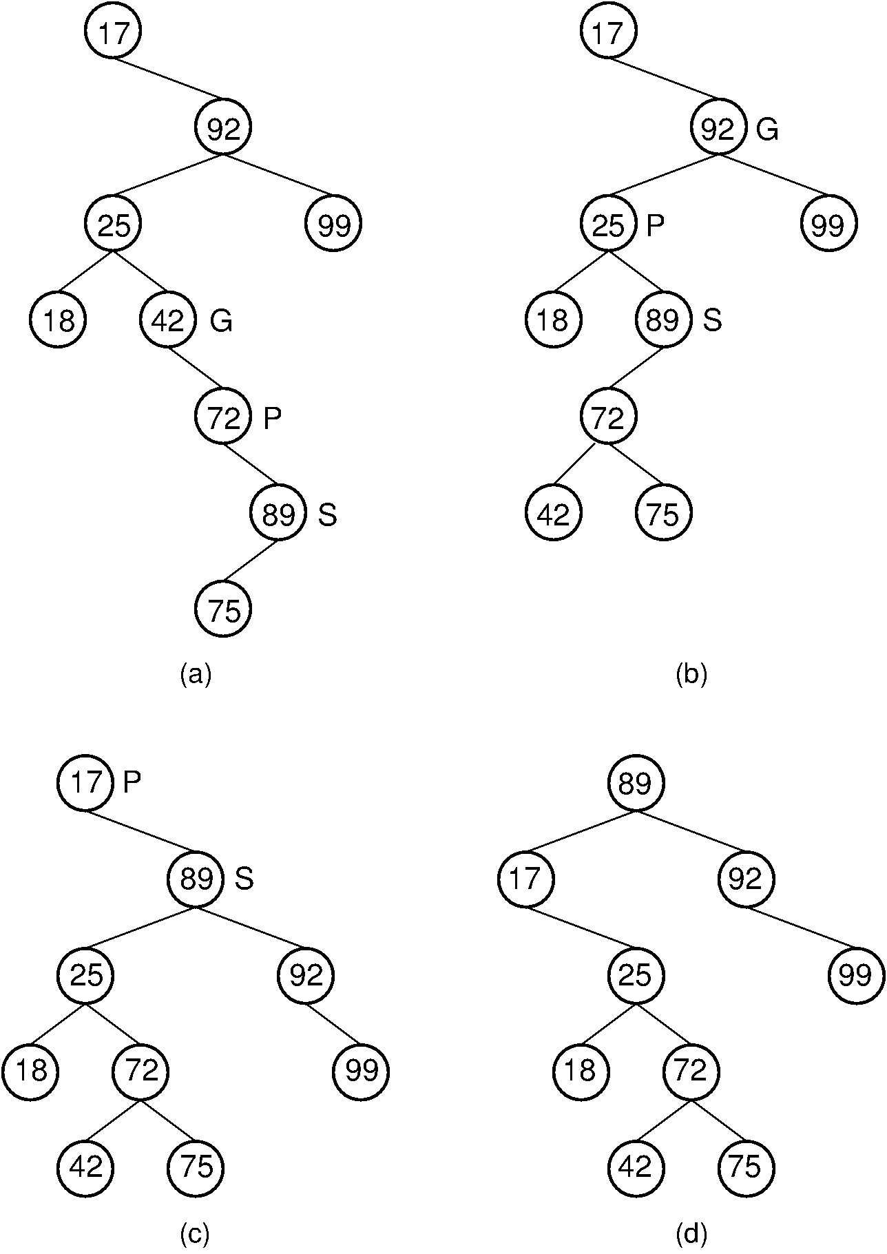 Figure 8.8.4: Example of splaying after performing a search in a splay tree. After finding the node with key value 89, that node is splayed to the root by performing three rotations. (a) The original splay tree. (b) The result of performing a zigzig rotation on the node with key value 89 in the tree of (a). (c) The result of performing a zigzag rotation on the node with key value 89 in the tree of (b). (d) The result of performing a single rotation on the node with key value 89 in the tree of (c). If the search had been for 91, the search would have been unsuccessful with the node storing key value 89 being that last one visited. In that case, the same splay operations would take place.