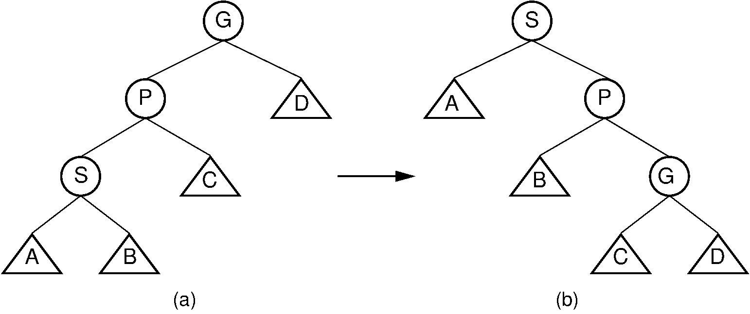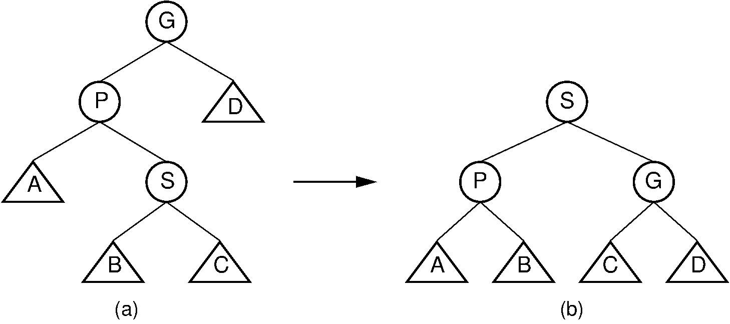 Unlike the AVL tree, the splay tree requires two types of double rotation. Double rotations involve \(S\), its parent (call it \(P\)), and \(S\) 's grandparent (call it \(G\)). The effect of a double rotation is to move \(S\) up two levels in the tree.